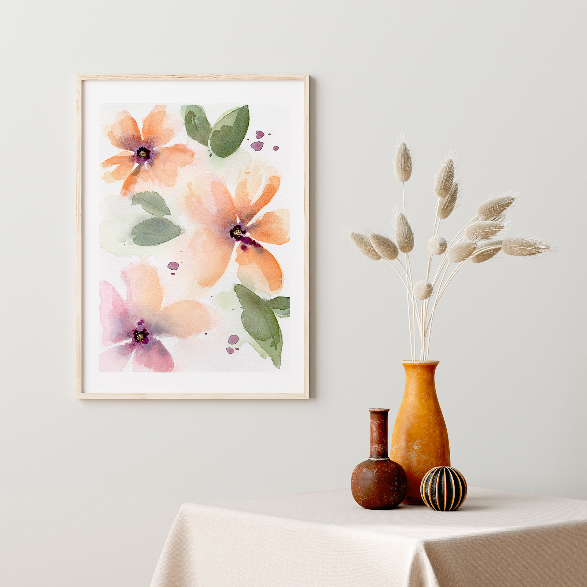 Naranjito es una acuarela floral de estilo suelto y moderno, donde los tonos naranjas y rosados se funden con frescura en un baile de pétalos ligeros. Una pieza que transmite alegría, suavidad y vitalidad, perfecta para proyectos decorativos y colaboraciones que busquen un lenguaje artístico lleno de color y naturaleza.