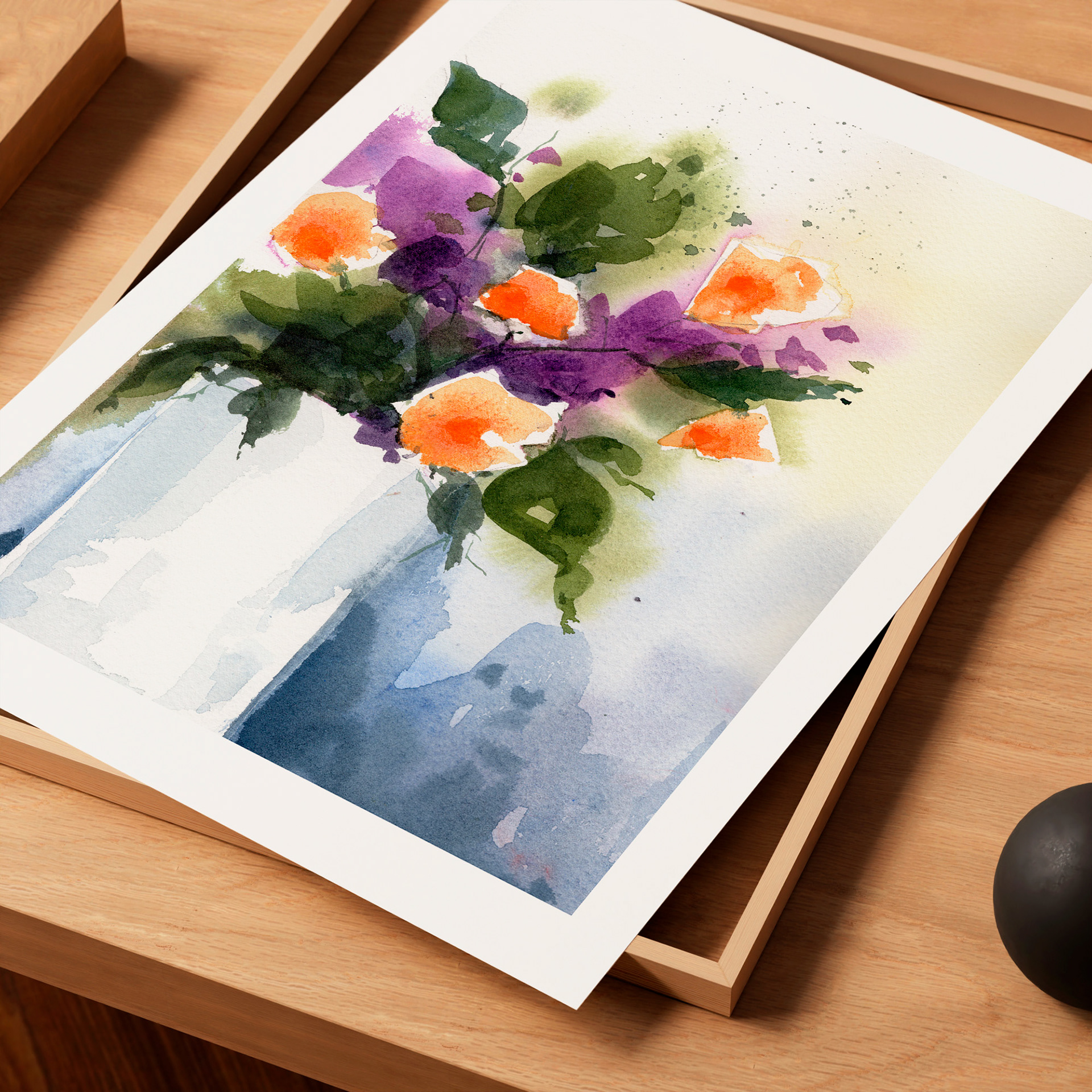 Capitana es una acuarela floral llena de energía, donde las flores naranjas y violetas se elevan con fuerza sobre un fondo suave y luminoso. Una obra de estilo suelto y moderno que transmite vitalidad, frescura y un aire romántico, ideal para proyectos de decoración y colaboraciones creativas que busquen un lenguaje visual vibrante y contemporáneo.