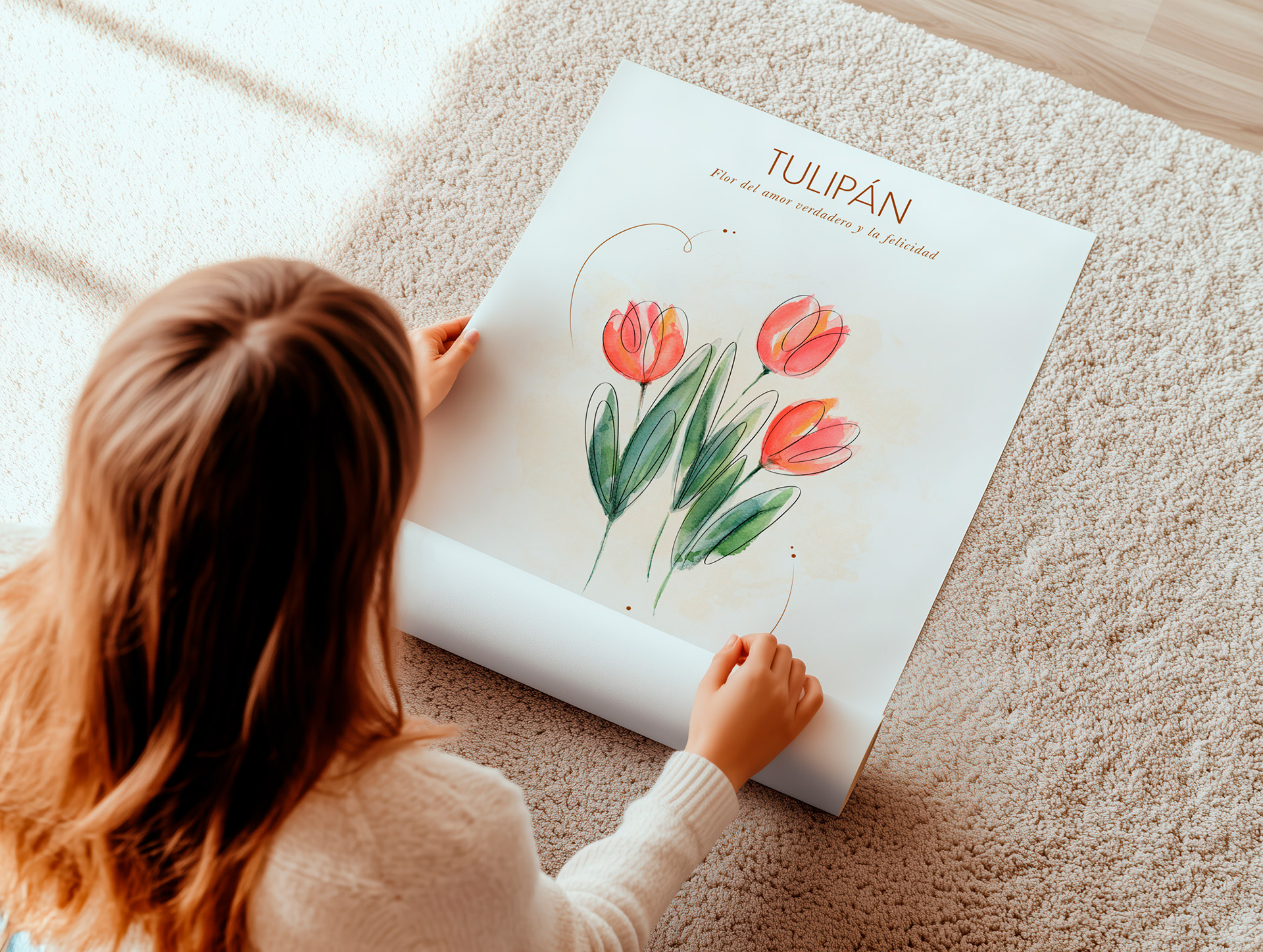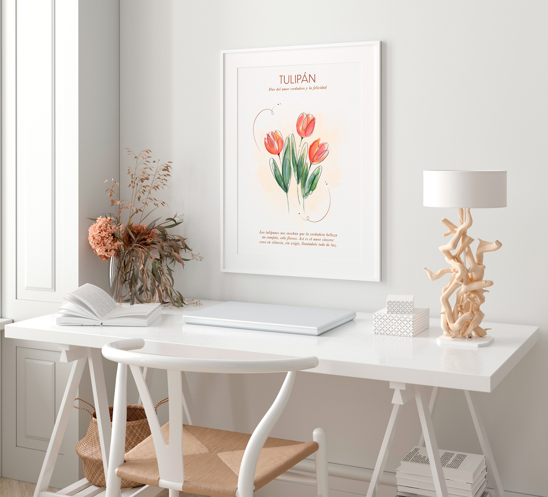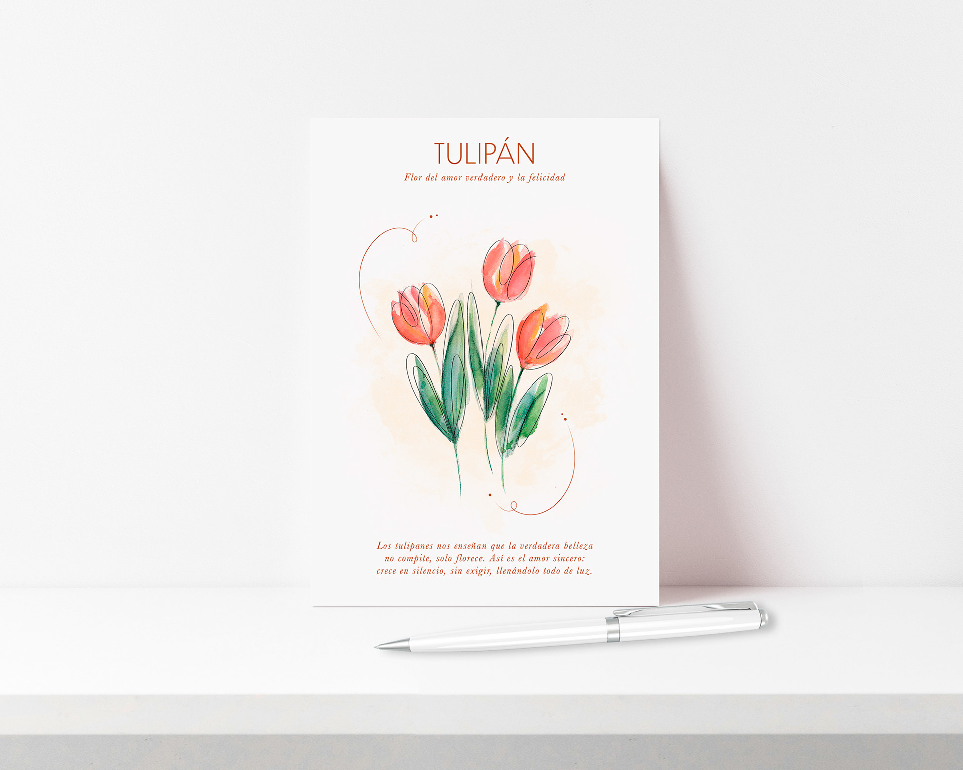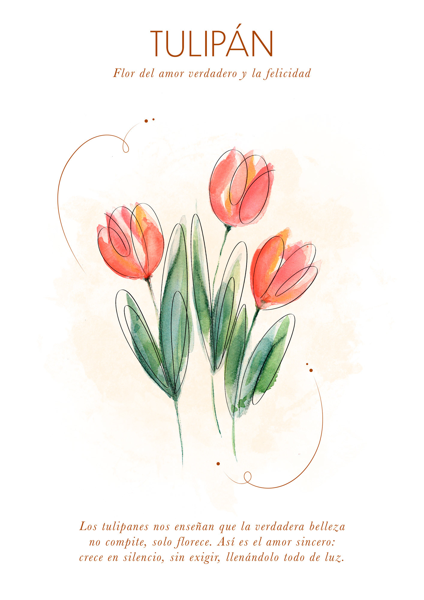 Representación en acuarela del tulipán, flor asociada al amor sincero y la felicidad. Una pieza minimalista y elegante que refleja sensibilidad artística.