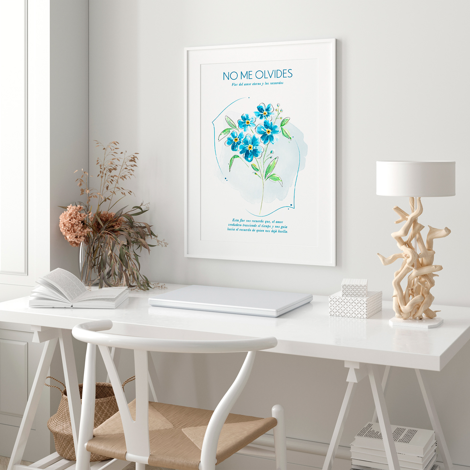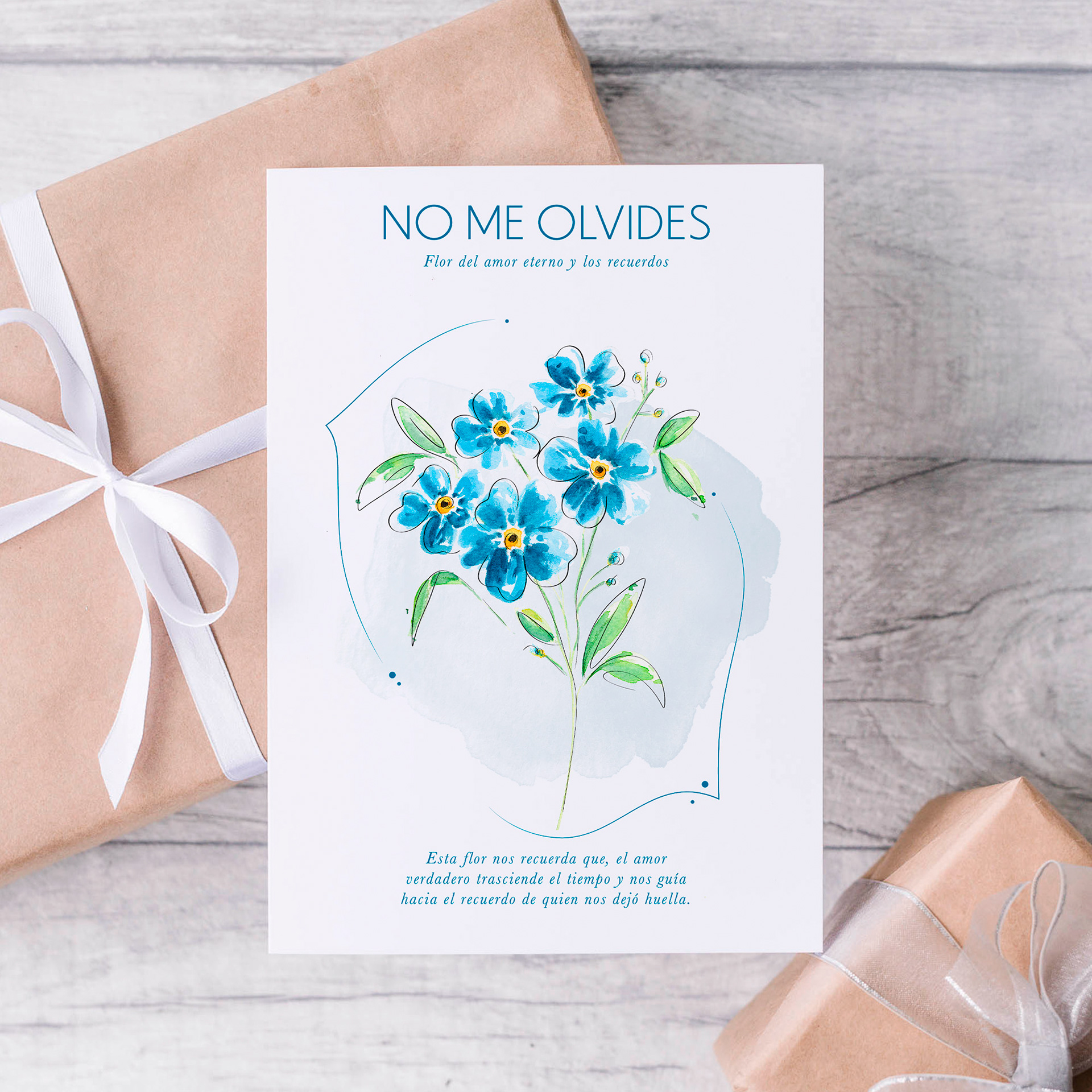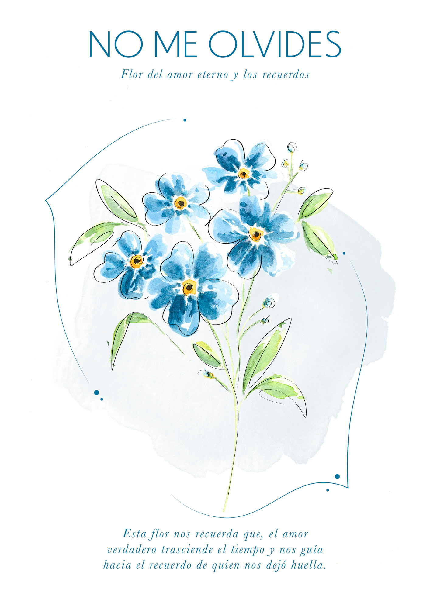 Ilustración botánica en acuarela de la flor no me olvides, símbolo de amor eterno y memoria. Trazos ligeros y expresivos que invitan a la contemplación y conectan con proyectos visuales contemporáneos.