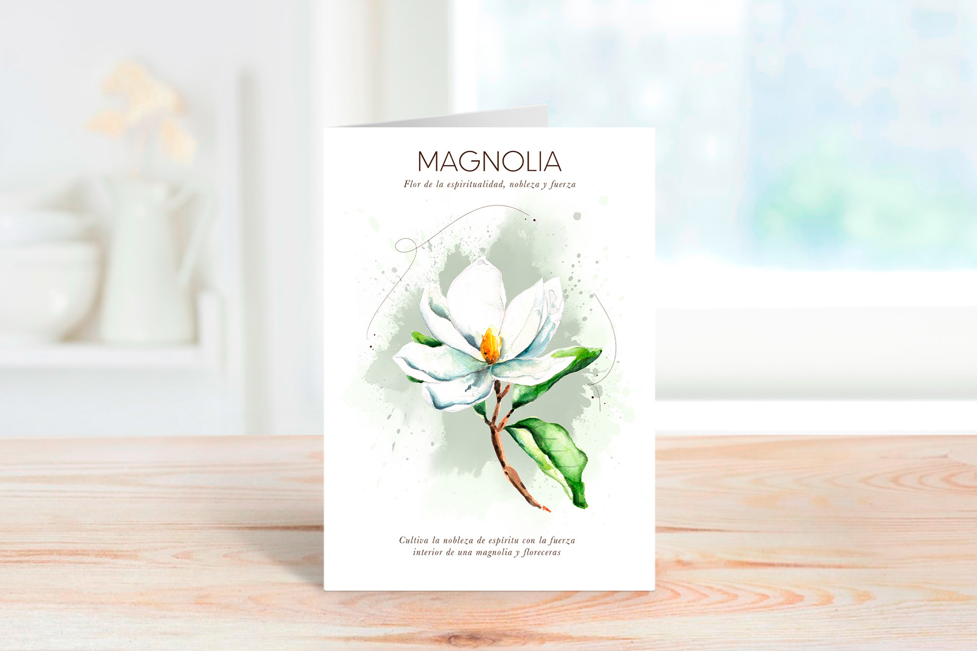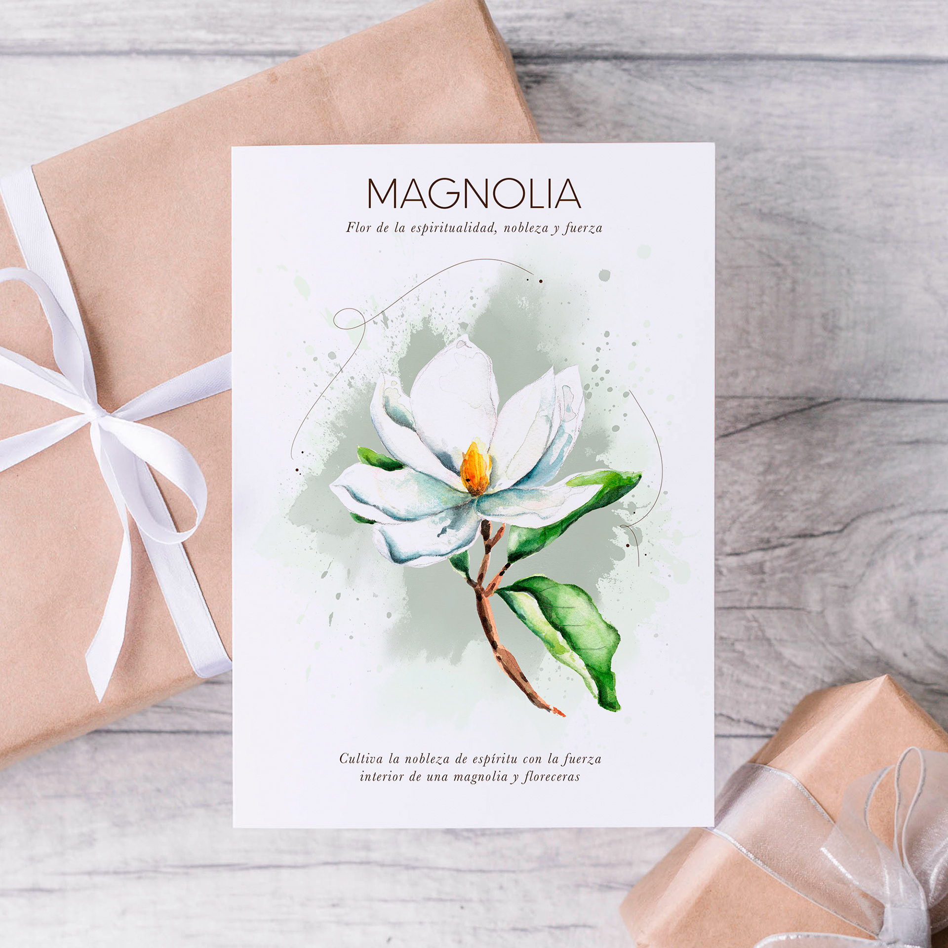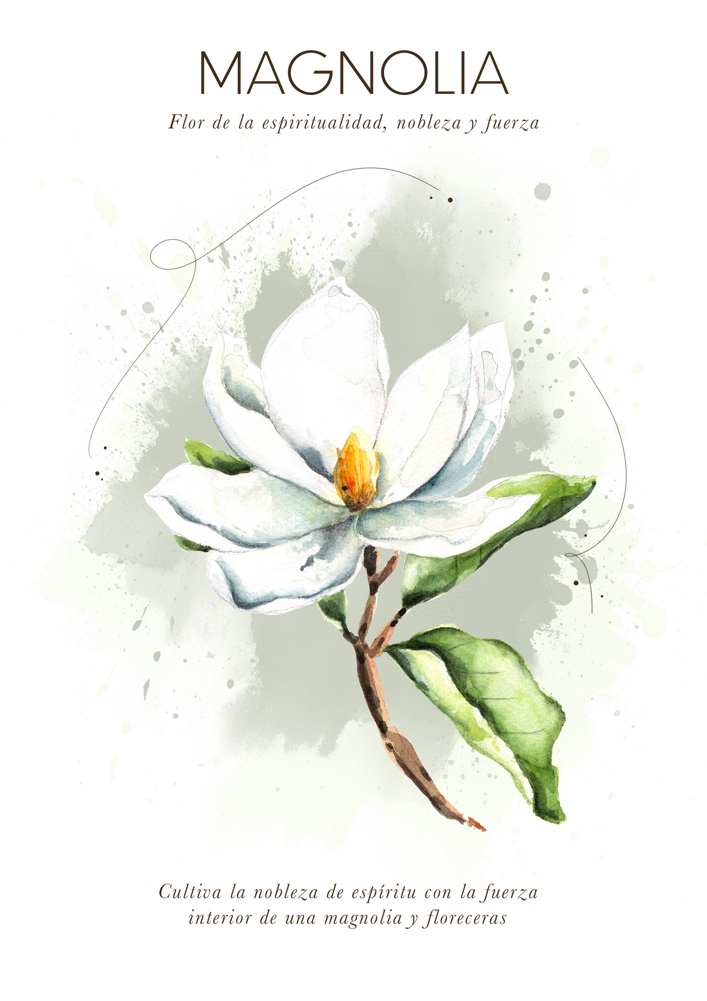 Acuarela botánica de la magnolia, flor que representa espiritualidad y nobleza. Una obra que transmite fuerza y serenidad a la vez.