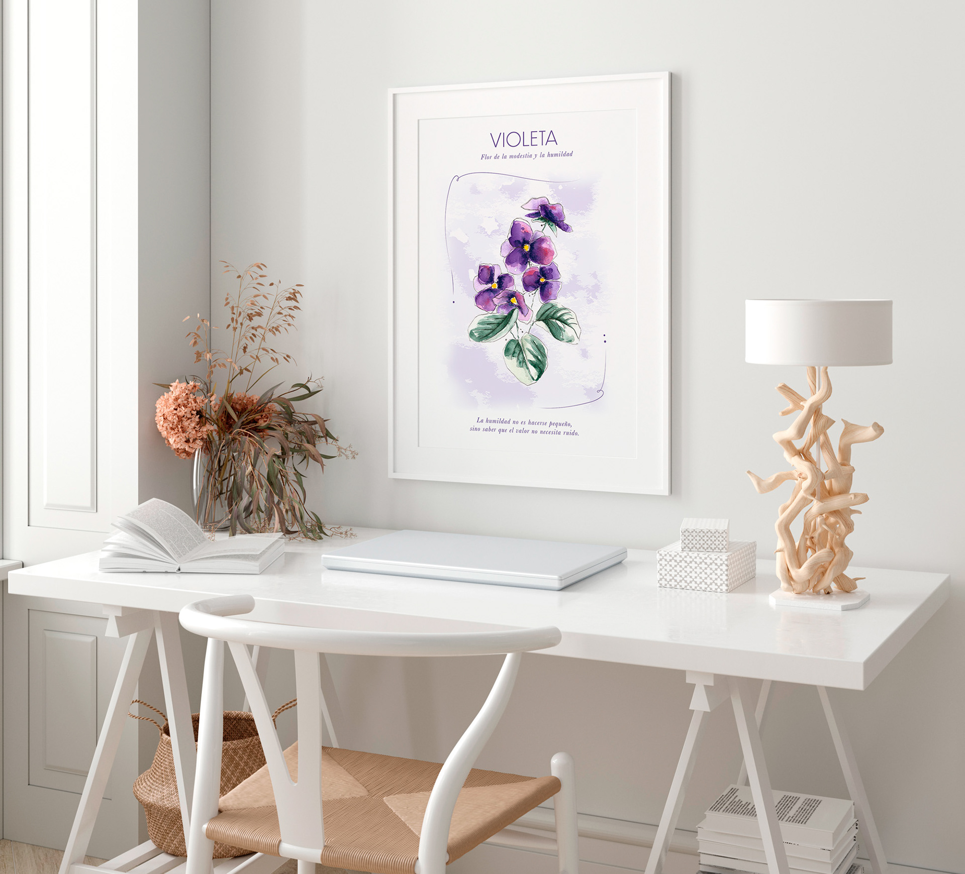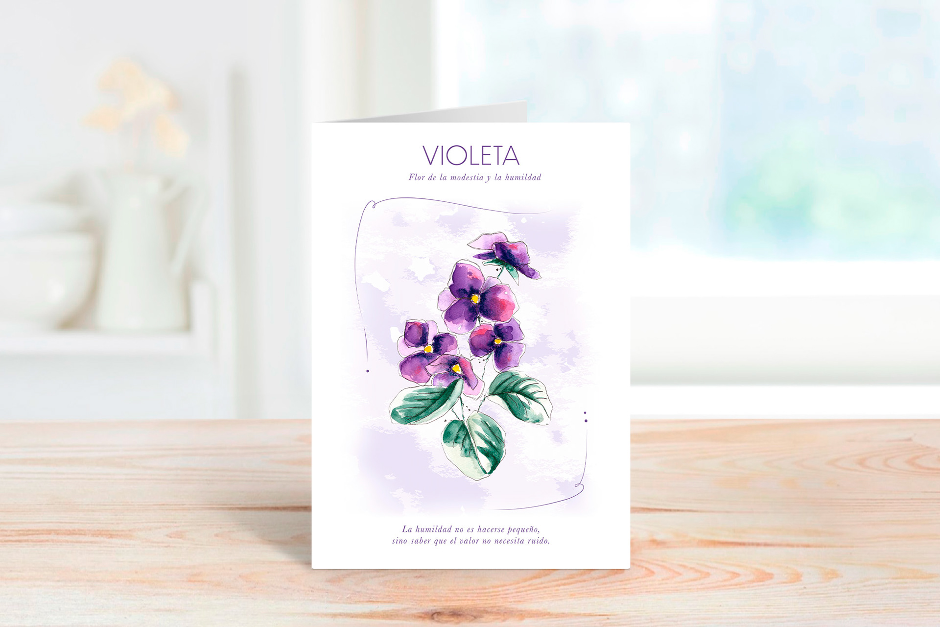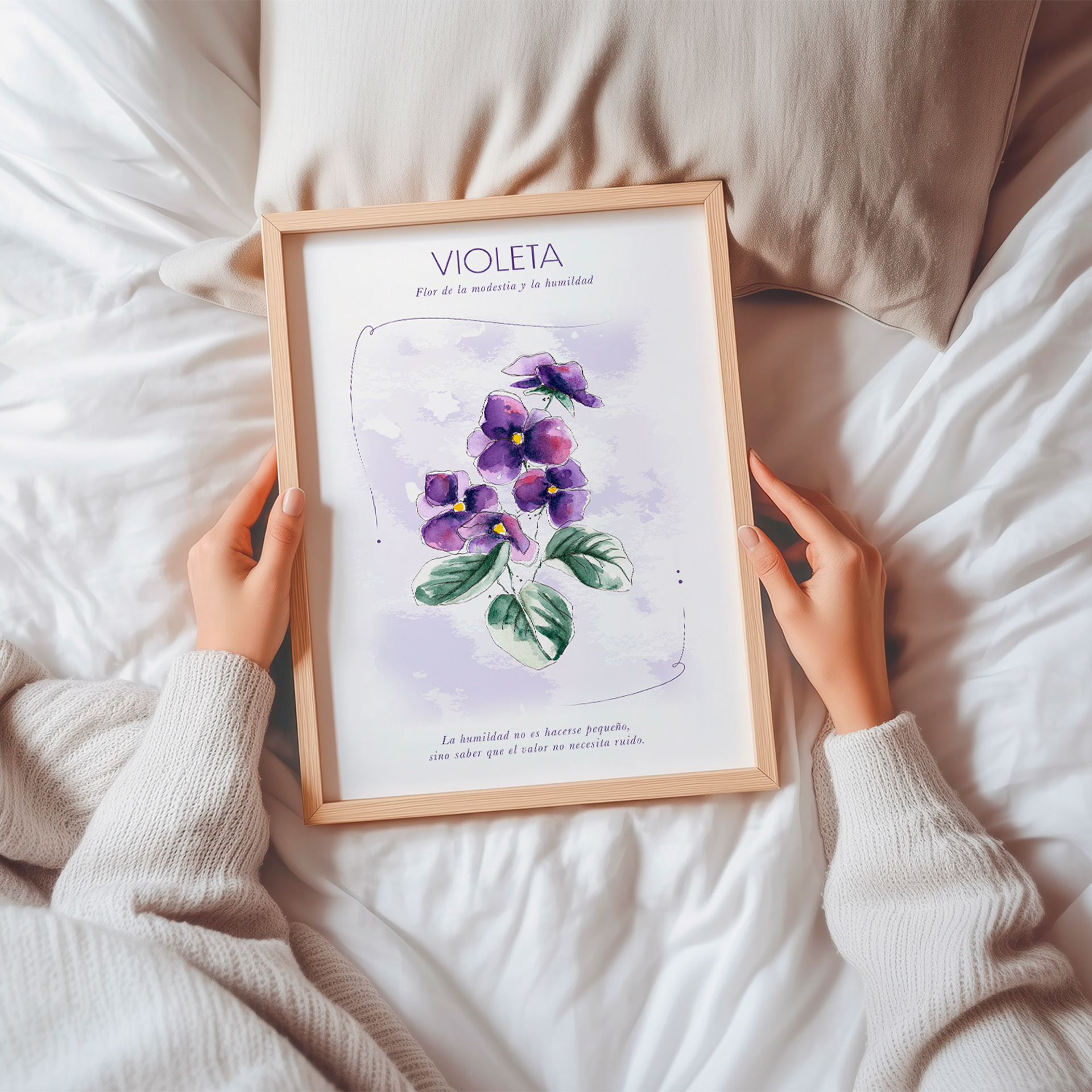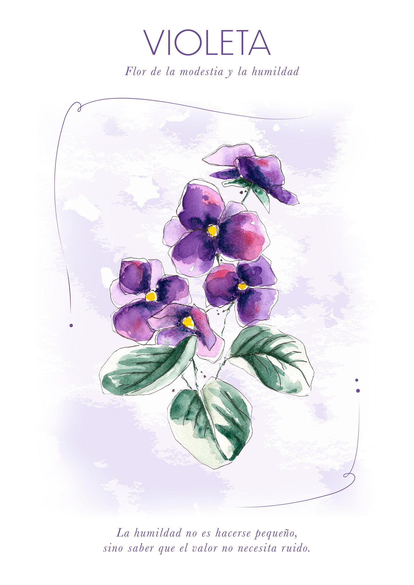 Ilustración en acuarela de la flor violeta, símbolo de modestia y humildad. Una obra delicada que combina botánica y poesía visual.