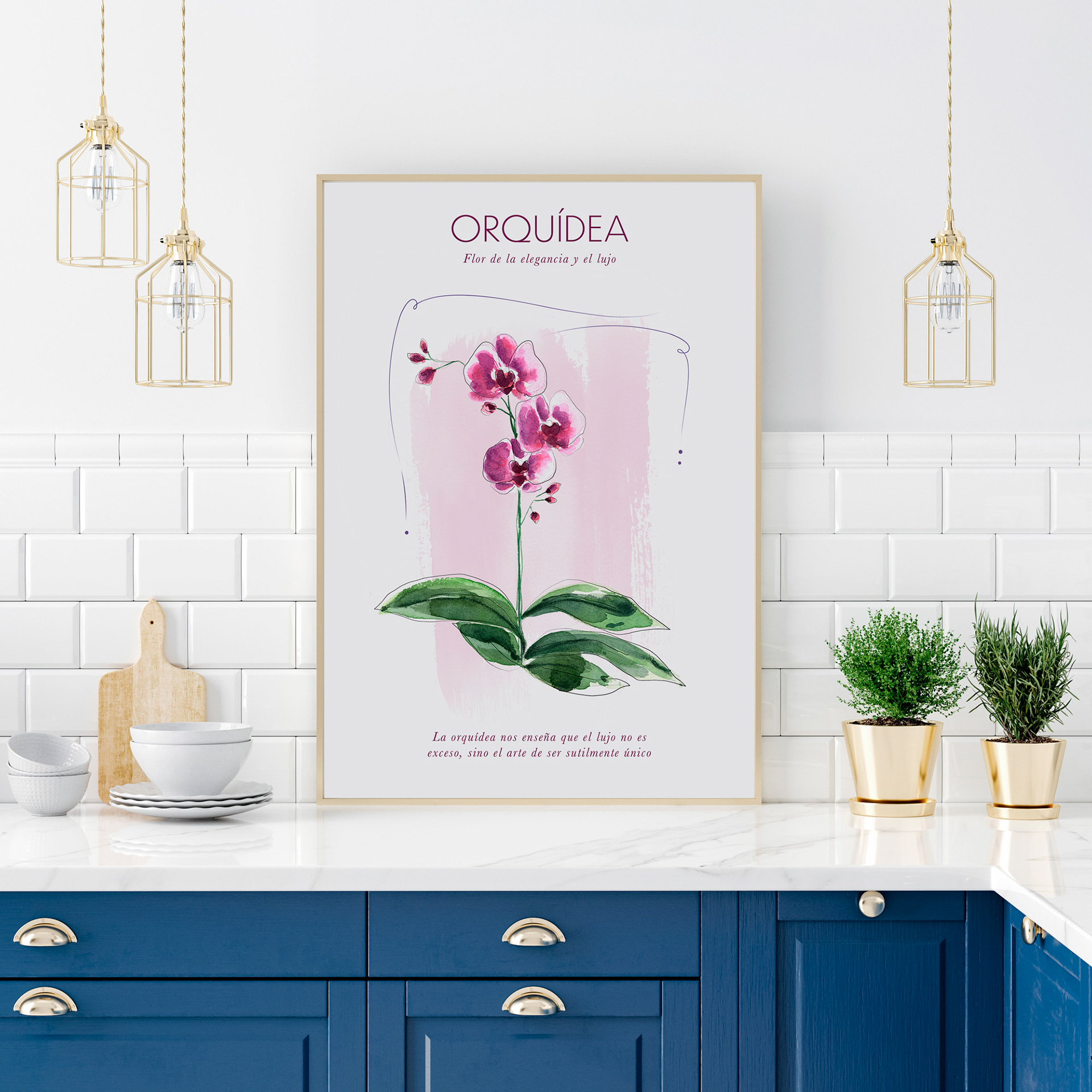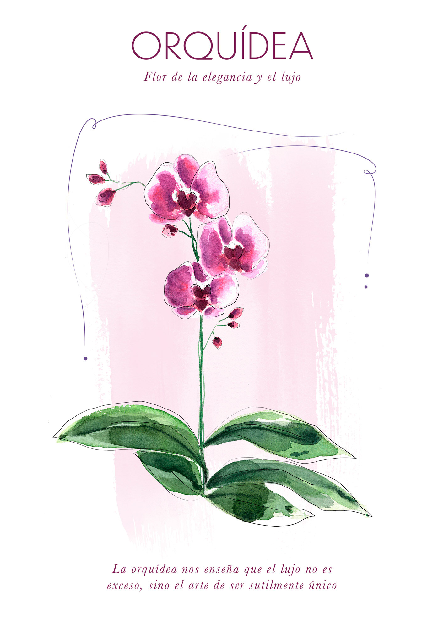 Ilustración en acuarela de la orquídea, flor símbolo de lujo y elegancia. Una obra que destaca por su delicadeza y composición refinada.